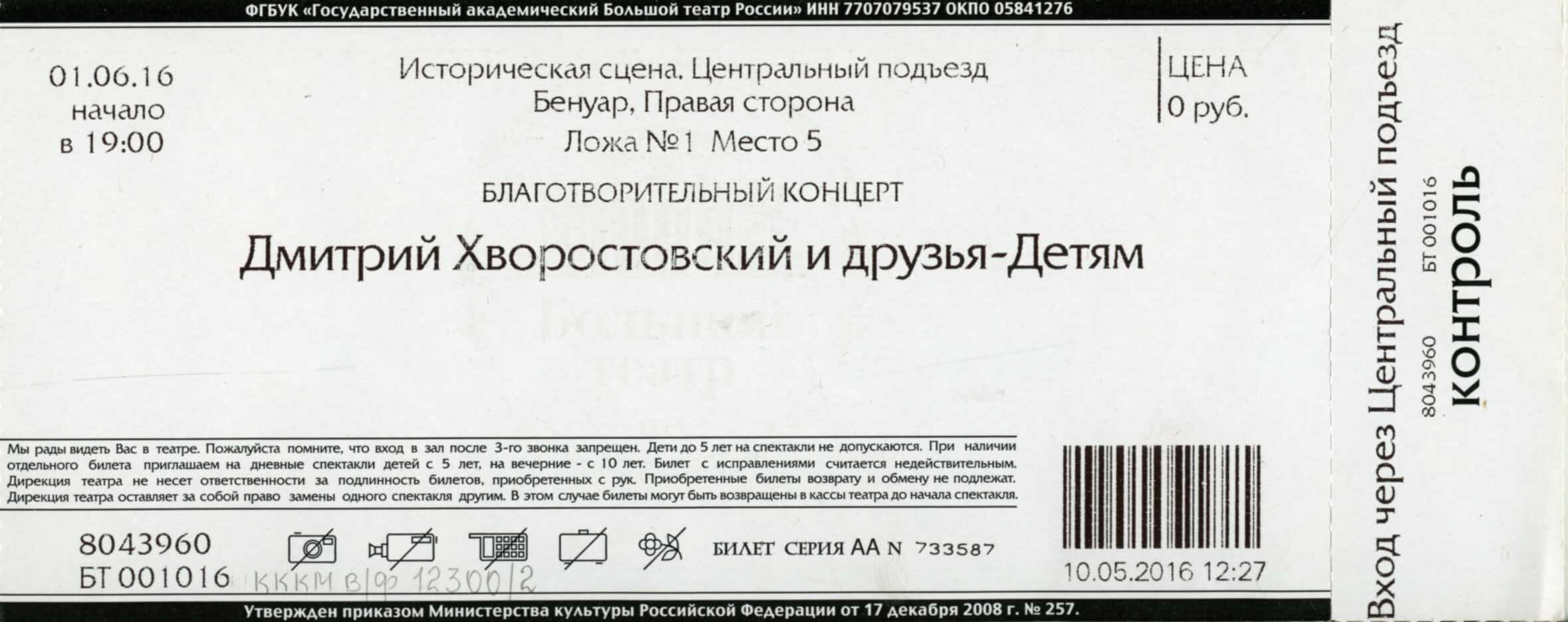 1 июня 2016 года в Большом театре состоялось ещё одно важное событие в творческой биографии певца — Благотворительный концерт «Дмитрий Хворостовский и его друзья – детям», собравший на сцене Большого театра оперных звёзд мировой величины. Они приехали из Америки, Швейцарии, Англии, чтобы помочь детям, которые борются с недетскими проблемами. «Видеть страдания в глазах ребёнка, вообще, страдания в глазах человека — это ужасно, а у ребёнка особенно. И когда это лицо озаряется жизнерадостной улыбкой, это главное, для чего нужно жить и стараться», — сказал тогда Дмитрий Хворостовский.