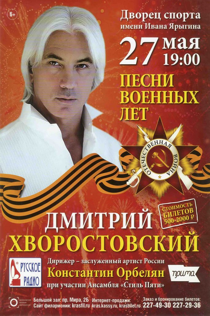 В 2015 году Дмитрий Хворостовский приезжает в Красноярск с новой программой «Песни военных лет» и даёт концерт во Дворце спорта имени Ивана Ярыгина. В выступлении приняли участие Красноярский академический симфонический оркестр под управлением Константина Орбеляна, хор колледжа искусств имени П.И. Иванова-Радкевича под руководством Татьяны Ходош и хор мальчиков и юношей «Каприччио» под управлением Ольги Андроновой.