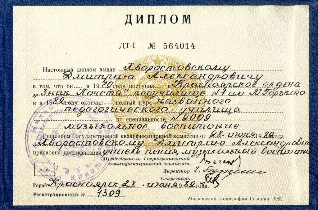 В 1981 году Хворостовский оканчивает педагогическое училище и получает диплом по специальности преподаватель музыки. В эти дни Галина Алексеевна напишет в своем дневнике: «Все, что я смогла сделать для него, я сделала. Вложила в него много души и сердца, дай Бог, чтобы это осталось бы в нем зернышком, и на Руси вырос бы еще один хороший певец, конечно, уже с помощью других хороших людей. Только бы он не сорвался где-нибудь в пути. Счастливого пути, мальчишка!».