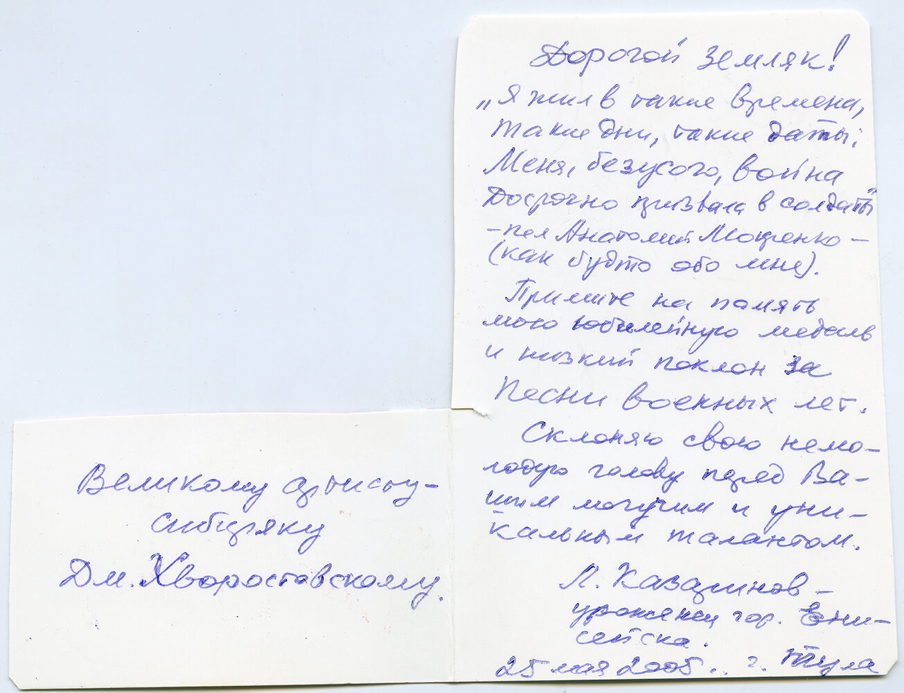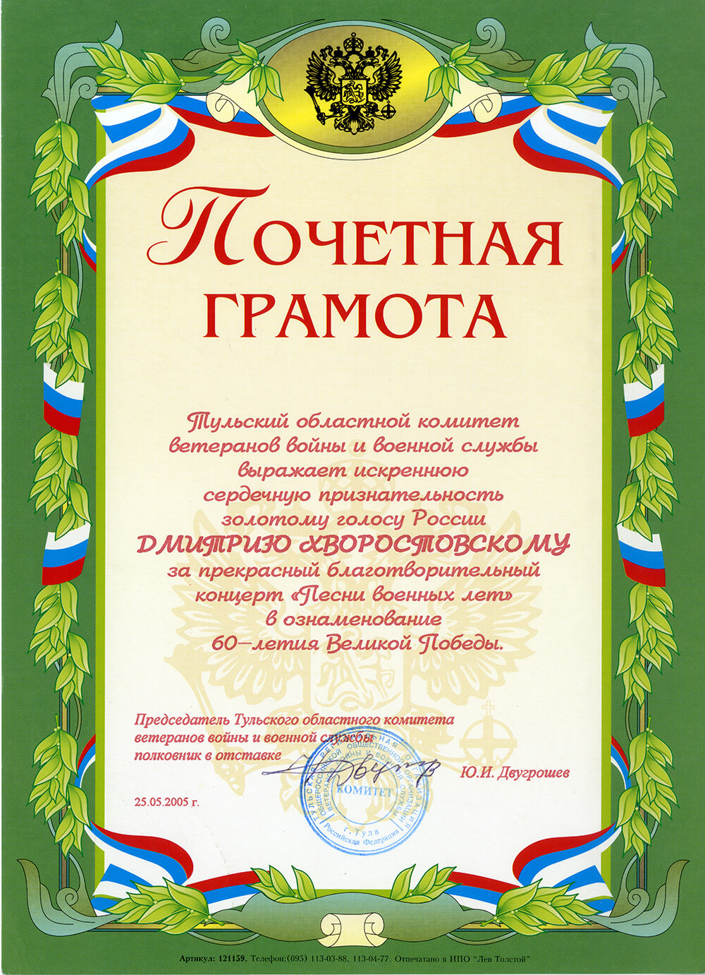 «Ни у одного оперного артиста не происходило в жизни такого события. Это огромная по своим масштабам акция – серия концертов в городах России в год 60-летия Победы, на которые надо пригласить всех ветеранов и отдать все билеты бесплатно», — рассказывал Хворостовский в интервью газете «Красноярский рабочий» (13 июня 2005 года). На одном из таких концертов вышел на сцену ветеран и сказал: «Я бы хотел выразить благодарность родителям Хворостовского за то, что они дали России такого сына». На другом концерте в городе Тула ветеран Великой Отечественной войны, уроженец г. Енисейска, Л. Казаринов подарил певцу свою юбилейную медаль к 60-летию Победы и написал в записке к ней: «Великому артисту-сибиряку Дмитрию Хворостовскому! Низкий поклон за песни военных лет. Склоняю свою немолодую голову перед Вашим могучим и уникальным талантом…».