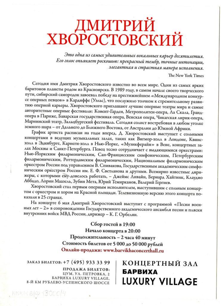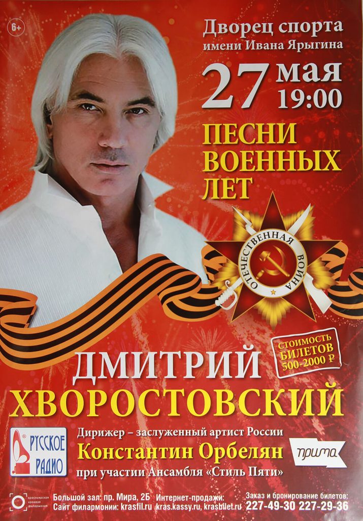 В 2005 году Дмитрий Хворостовский совершает историческое турне по городам России, исполняя перед сотнями тысяч людей программу в память о солдатах Великой Отечественной войны. Помимо Москвы и Санкт-Петербурга он посетил Волгоград, Смоленск, Екатеринбург, Тулу, Красноярск, Самару, Новосибирск. Причём включение в гастрольный тур Красноярска было обязательным условием артиста. Это был самый масштабный гастрольный тур. Никогда ещё на гастроли по России не ездило столько человек – 250. В это число входили: Государственный академический камерный оркестр под управлением К. Орбеляна, Большой детский хор под управлением В. Попова, хор Академии хорового искусства и Всемирный детский хор ЮНЕСКО, в котором принимали участие и дети-инвалиды.