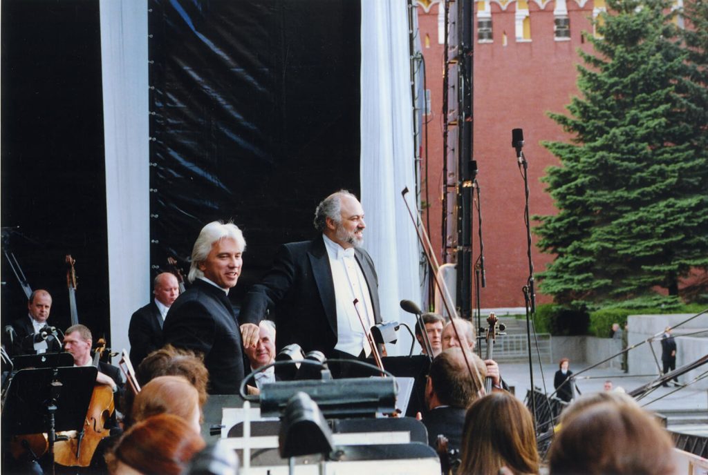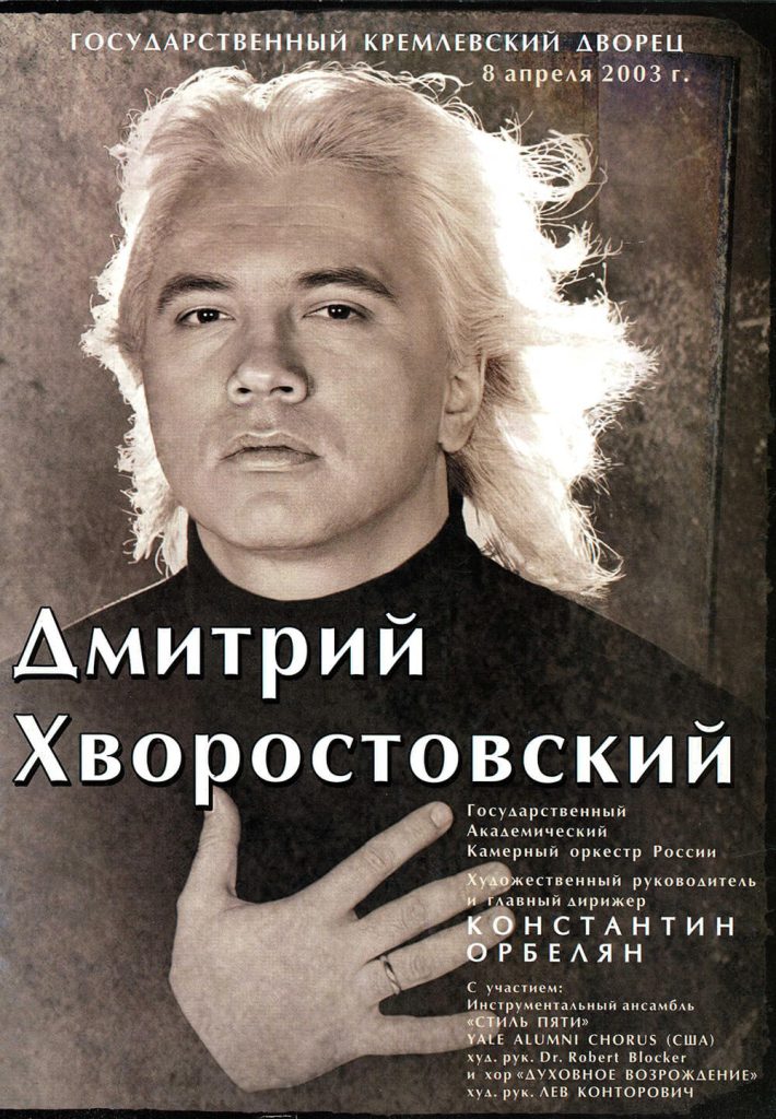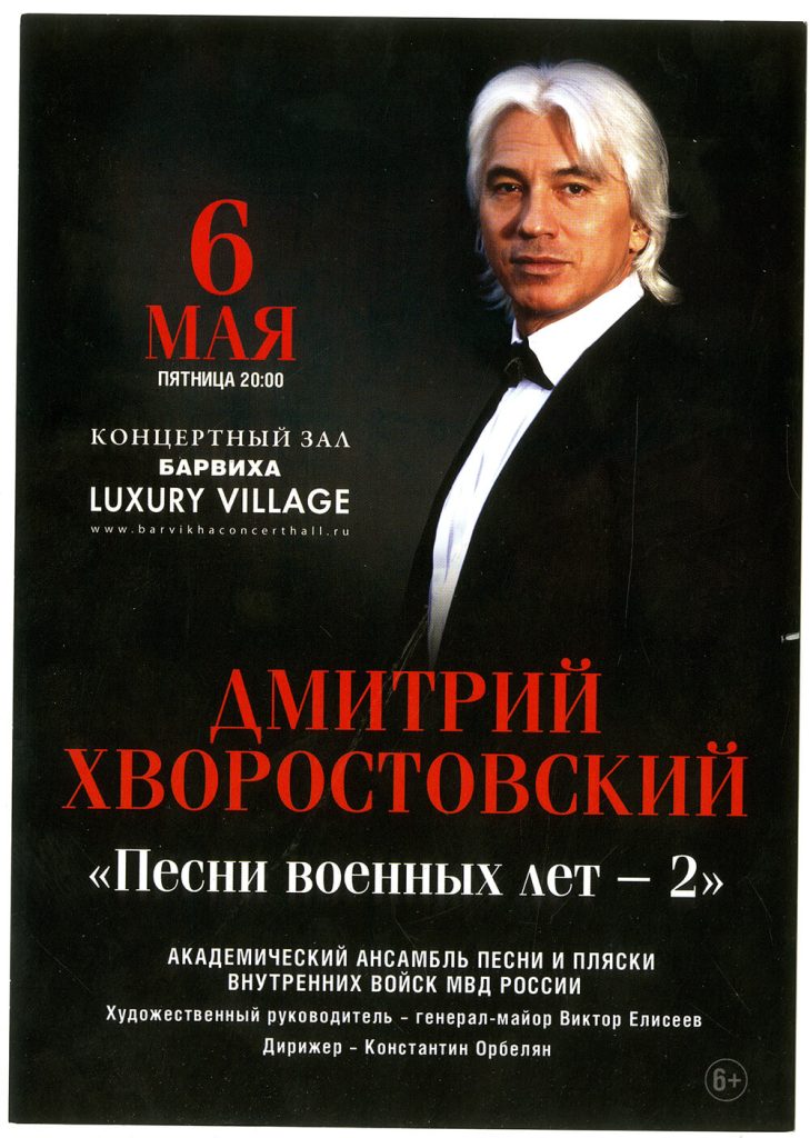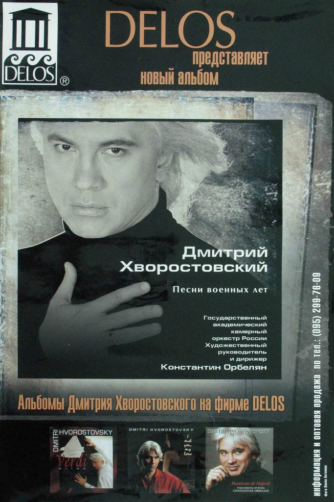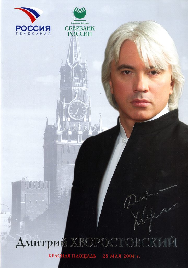 В мае 2004 года первый из русских оперных исполнителей, Хворостовский, даёт сольный концерт в сопровождении оркестра и хора на Красной площади в Москве. Билеты на концерт не продавались, а раздавались ветеранам войны, студентам и школьникам. В первом отделении певец представил оперный репертуар, а во втором звучали песни военных лет, лучшие образцы советской пес программу вошли: «Вот солдаты идут» К. Молчанова, «Тёмная ночь» Н. Богословского, «Эх, дороги» А. Новикова, «На Безымянной высоте» В. Баснера, «Журавли» Я. Френкеля и другие. Закончил свою программу Дмитрий Хворостовский «Песней о Москве». Многотысячная зрительская аудитория встала и, хлопая в такт музыке, запела вместе со своим народным артистом! Этот концерт транслировался в прямом эфире по телевидению. Его увидели зрители 25 стран мира! Присутствие на концерте президента России В.В. Путина было свидетельством неординарности этого концерта и высокой оценки деятельности российского певца, своим творчеством прославляющего родную страну.