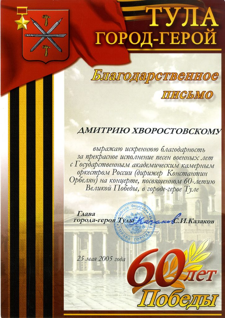 «Ни у одного оперного артиста не происходило в жизни такого события. Это огромная по своим масштабам акция – серия концертов в городах России в год 60-летия Победы, на которые надо пригласить всех ветеранов и отдать все билеты бесплатно», — рассказывал Хворостовский в интервью газете «Красноярский рабочий» (13 июня 2005 года). На одном из таких концертов вышел на сцену ветеран и сказал: «Я бы хотел выразить благодарность родителям Хворостовского за то, что они дали России такого сына». На другом концерте в городе Тула ветеран Великой Отечественной войны, уроженец г. Енисейска, Л. Казаринов подарил певцу свою юбилейную медаль к 60-летию Победы и написал в записке к ней: «Великому артисту-сибиряку Дмитрию Хворостовскому! Низкий поклон за песни военных лет. Склоняю свою немолодую голову перед Вашим могучим и уникальным талантом…».