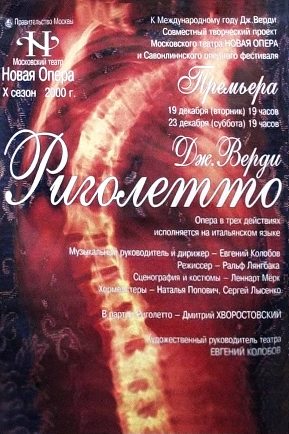 В декабре 2000 года Хворостовский принимает приглашение Евгения Колобова исполнить сложнейшую для баритона партию Риголетто в Московском театре «Новая Опера». Это был совместный проект Савоннлинского оперного фестиваля (Финляндия) и «Новой Оперы» (режиссёр — Ральф Лянгбака (Финляндия), дирижёр — Евгений Колобов (Москва). После премьеры спектакль наградили множеством эпитетов: превосходный, шедевр, лучшая постановка «Новой Оперы», настоящий вердиевский спектакль!