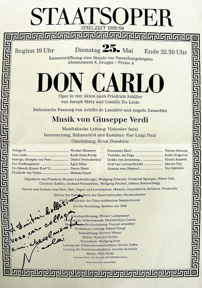 В декабре 2001 – январе 2002 года легендарный театр Метрополитен Опера осуществляет свою постановку «Дон Карлоса», где в роли Родриго ди Поза знаменитый русский баритон. В звездный состав постановки входили: Дон Карлос – Ричард Марджисон, Филип II – американский бас Самюэль Реми, Елизавета – чилийская сопрано Вероника Вилльярроэль.