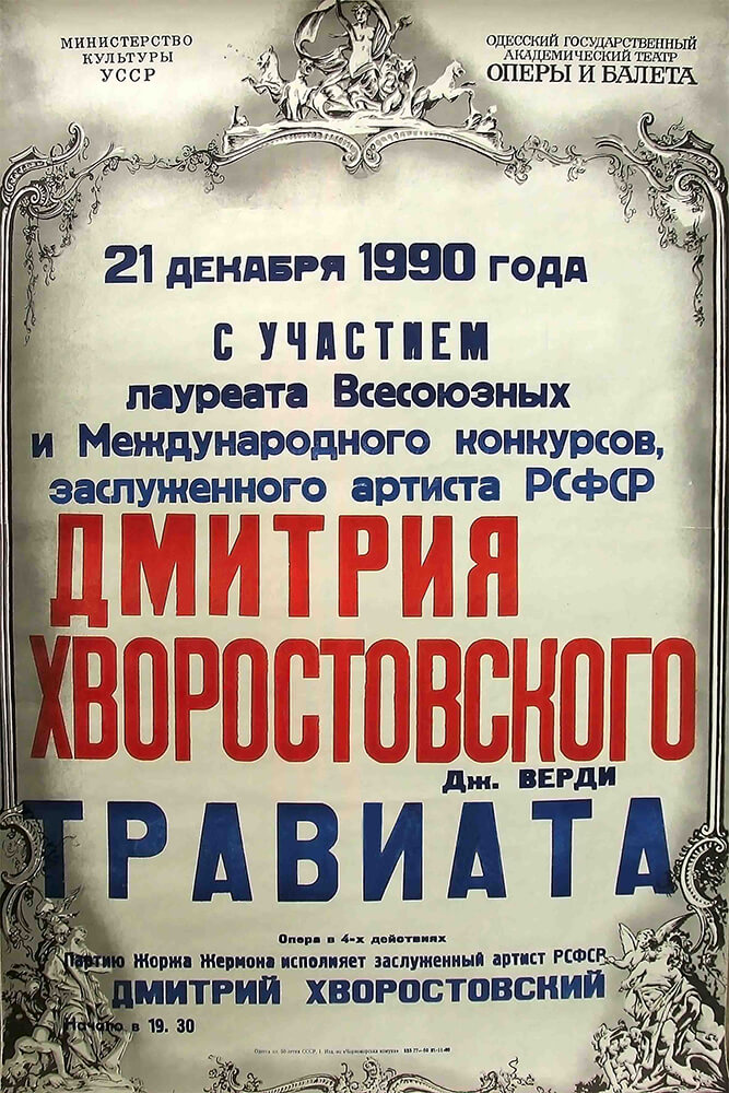 В опере Дж. Верди «Травиата» Дмитрий Хворостовский пел в течение всей жизни, начиная с Красноярского театра оперы и балета в 1988 году и по 2016 год. Именно эта опера стала последней в его короткой жизни, в ноябре 2016 года. В сентябре 1993 года состоялся американский дебют в Лирик Опере в Чикаго (Lyric Opera of Chicago). Спектаклем открывался 1993/1994 сезон. В сезоне 2003-2004 года Хворостовский поёт отца Жермона в постановке «Травиаты» в Метрополитен Опера. Виолетту Валери играет великолепная Рене Флеменг.